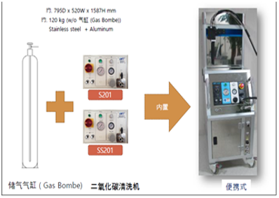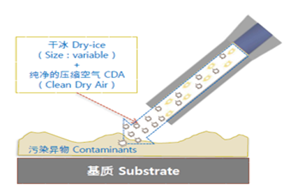 –物理衝突(Physical Blasting): 通過 高壓空氣 將 “乾冰粒子” 高速噴射到清洗表面衝突熱衝突(Thermal Shock)當-78.5攝氏度的乾冰因昇華熱, 異物質收縮發生裂膨漲(Sublimation expansion)體積至800倍, 境界面破損剝離(Ablation)高速壓縮空氣使之引發剝離現象